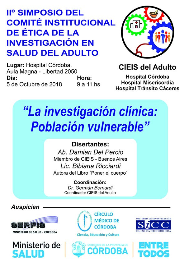 El Comité Institucional de Ética de Investigación del Adulto de la Provincia de Córdoba (CIEIS del Adulto) invita a integrantes del equipo de salud y a la comunidad en general al: II Simposio: “La Investigación Clínica: Población Vulnerable”El mismo se llevará a cabo el viernes 5 de octubre de 2018 de 9 a 11 horas, en el Aula Magna del Hospital Córdoba, calle Libertad 2050, de la ciudad de Córdoba.