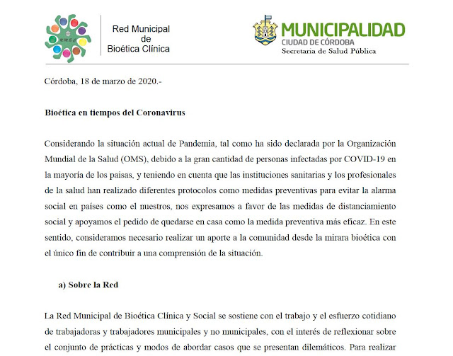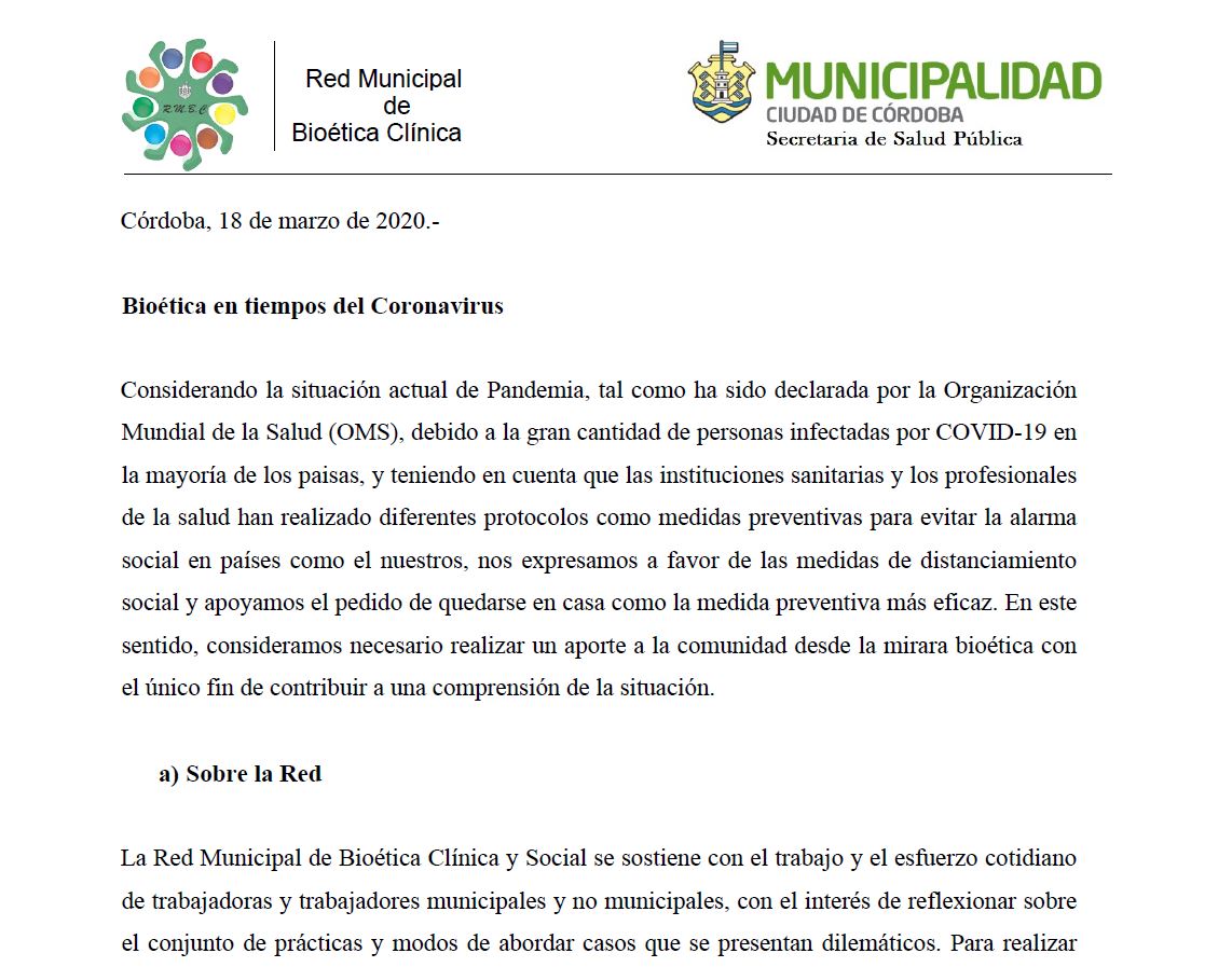 Bioética en Tiempos de Coronavirus. Comunicado Red Municipal de Bioética Deje un comentario Documento de la Red Municipal de Bioética