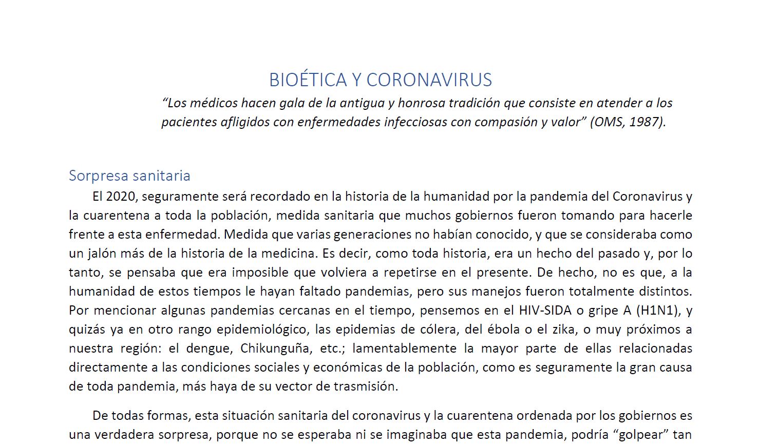 Bioética y Coronavirus . Reflexiones desde la bioética en estos tiempos de pandemia Deje un comentario Por Andrés Toledo Texto Completo para descargar