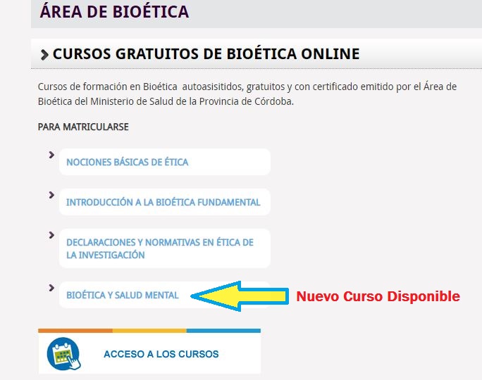 Con gran alegría para el Área de Bioética, es que les informamos que ya se encuentra disponible un nuevo curso online gratuito que ofrece el Área de Bioética del Ministerio de Salud de la Prov. de Córdoba, que trata sobre la relación de la “Bioética y salud mental”.