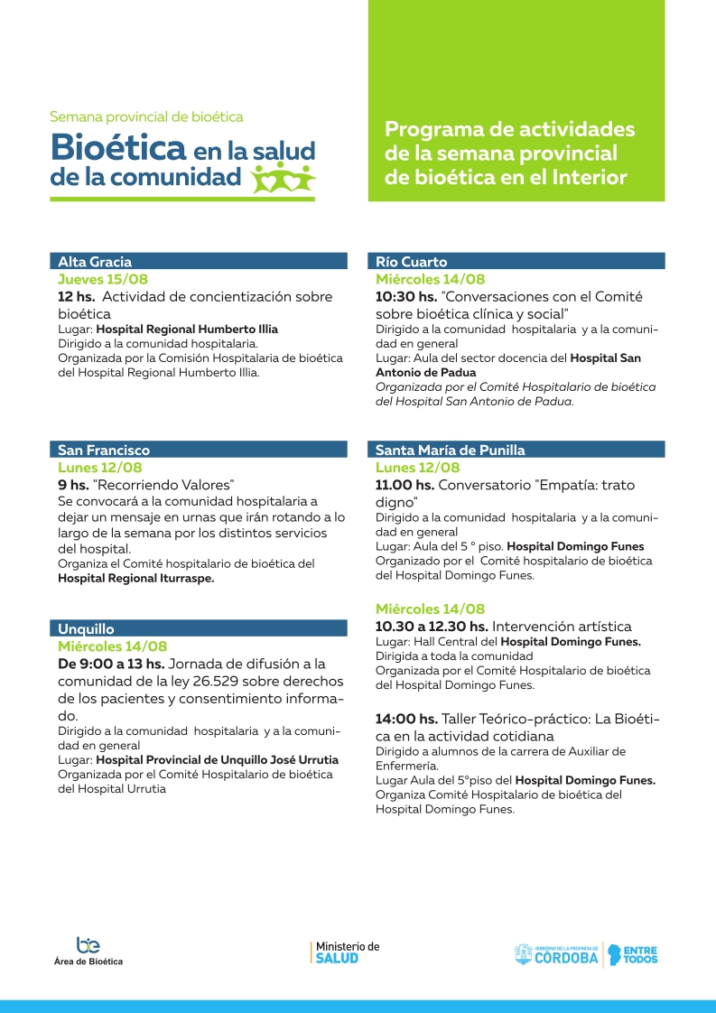 El Ministerio de Salud de la Provincia informó que comienza la Semana Provincial de la Bioética. Con el lema “Bioética en la salud de la comunidad”, este año la iniciativa busca sensibilizar a la sociedad sobre distintos aspectos vinculados a esta temática.