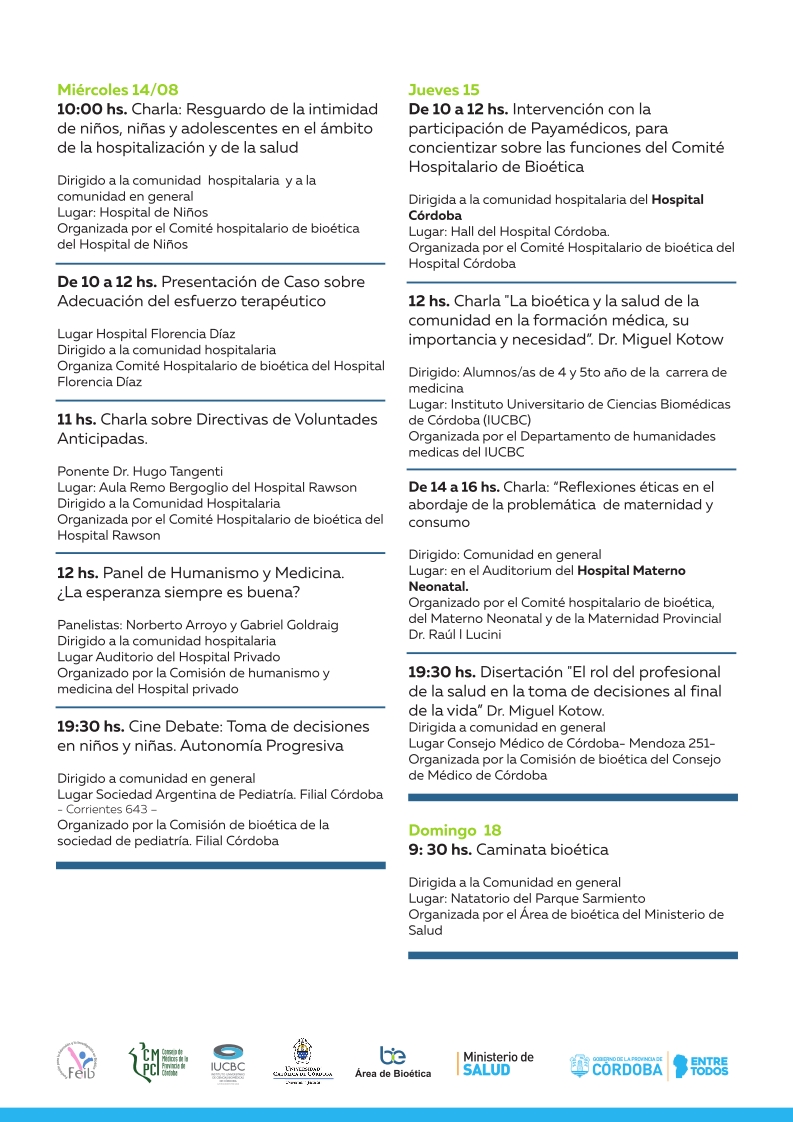 La iniciativa incluirá conferencias y mesas redondas en las que se abordarán temas como resguardo de la intimidad de niños, niñas y adolescentes; paliativismo juvenil, vulnerabilidad, bioética y derechos humanos; derechos y responsabilidades de las personas en instituciones de salud; adecuación del esfuerzo terapéutico; directivas de voluntades anticipadas; maternidad y consumo; humanismo y medicina; toma de decisiones en niños y niñas; trato digno; consentimiento informado y bioética clínica y social.