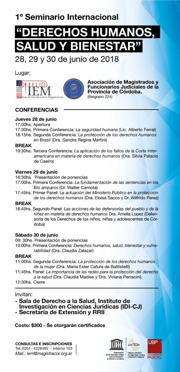 La Sala de Derecho a la Salud del Instituto de Investigación en Ciencias Jurídicas (IDI-CJ) y el Centro de Relaciones Internacionales de la UBP invitan a participar del “I Seminario Internacional de Derechos Humanos, Salud y Bienestar” que se realizará el 28, 29 y 30 de junio de 2018 en la Asociación de Magistrados y Funcionarios Judiciales de la Provincia de Córdoba (Belgrano 224).